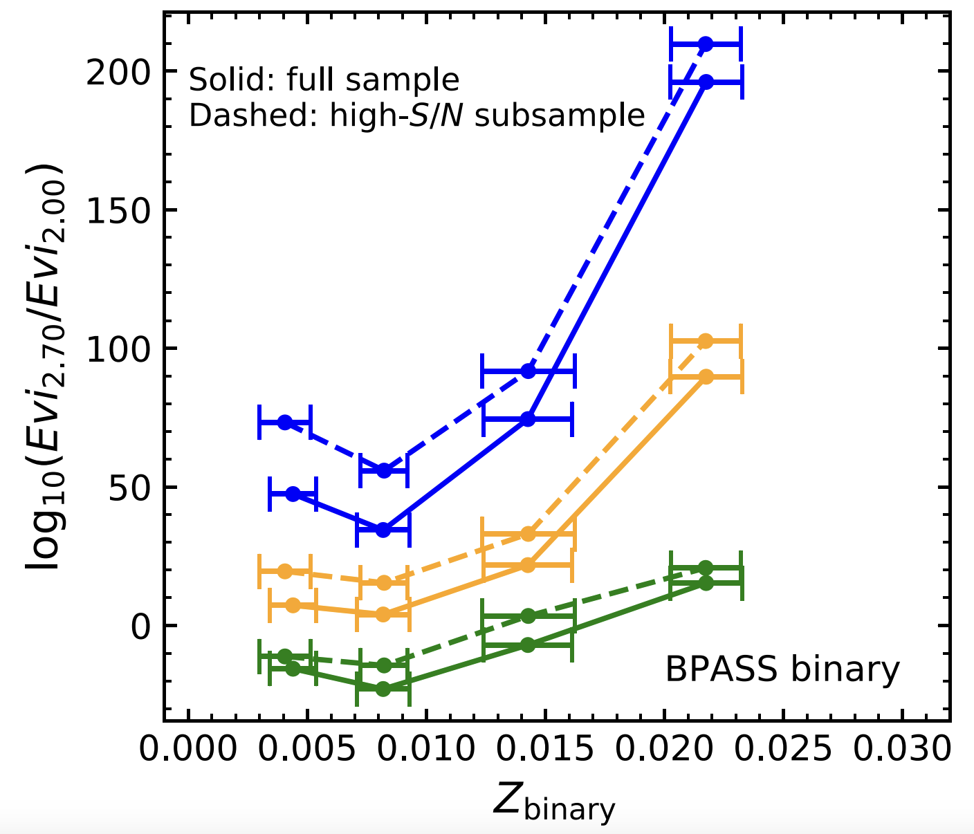 When stars form out of a molecular cloud, what is the initial mass distribution? This is important as stars with different initial masses have drastically different evolution paths and feedback mechanism/strength. I studied the high-mass-end power-law slope of this so-called stellar initial mass function, and found evidence of its variation with metallicity. The figure shows the Bayesian evidence ratio for the two slope assumptions (-2.70 and -2.00). The ratio (y axis) changes with metallicity (x axis). The evidence is derived from Bayesian modelling of a sample of Wolf-Rayet region spectra, which are binned by their metallicities. The three colours correspond to the three quartiles.